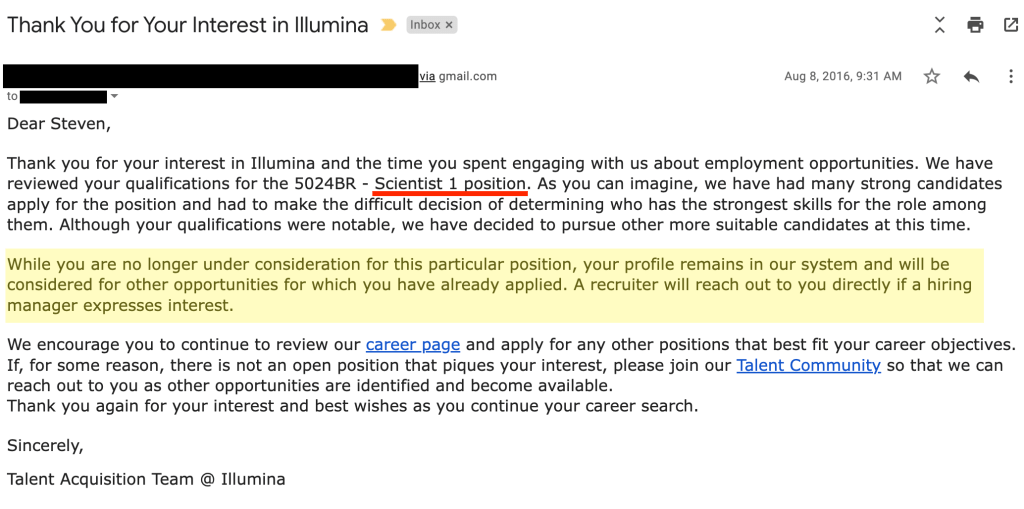 I guess I interpreted that message as “apply to the Scientist 1 role”! LOL! To the surprise of no one, I received the following REJECTION email (see below)! Ha, facepalm! Duh!